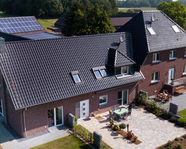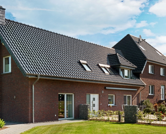 Deze tijdloos moderne vlakke dakpan TIEFA XL TOP® wordt gekenmerkt door zijn zachte welving en harmonisch rustige, duidelijk gestructureerde oppervlakte-effect. Het flexibele middenformaat van de populaire TIEFA XL TOP® is bovendien bijzonder economisch en universeel toepasbaar - en niet alleen voor platte hellende daken.
