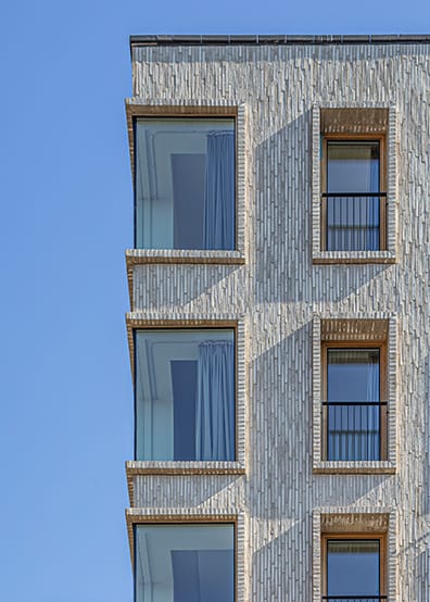 Medan de extra långa Ultima-tegelstenarna används tillsammans med normallängdstegel i samma färg, för att skapa en subtil och rytmisk kontrast, är teglets slagna struktur konsekvent genom hela projektet. Slagna tegelstenar har en skör textur som skapas genom att tegelstenarna avlägsnas från sina formar med hjälp av vatten. Vattnet och själva formen lämnar sina respektive avtryck på tegelstenarna, vilket får varje enskild tegelsten att skilja sig något från de andra. Tegelstenarna är släta men deras subtila textur skapar visuellt intresse, särskilt när de används i stor skala. Kontrasten mellan Ultima-tegelstenarnas vertikala inpassning och den horisontella användningen av vanliga tegelstenar är en okynnig detalj som gör detta projekt till ett av Köpenhamns mest raffinerade moderna murverk. En dramatisk twist med två tegelstenar samlade i en mycket speciell symbios.