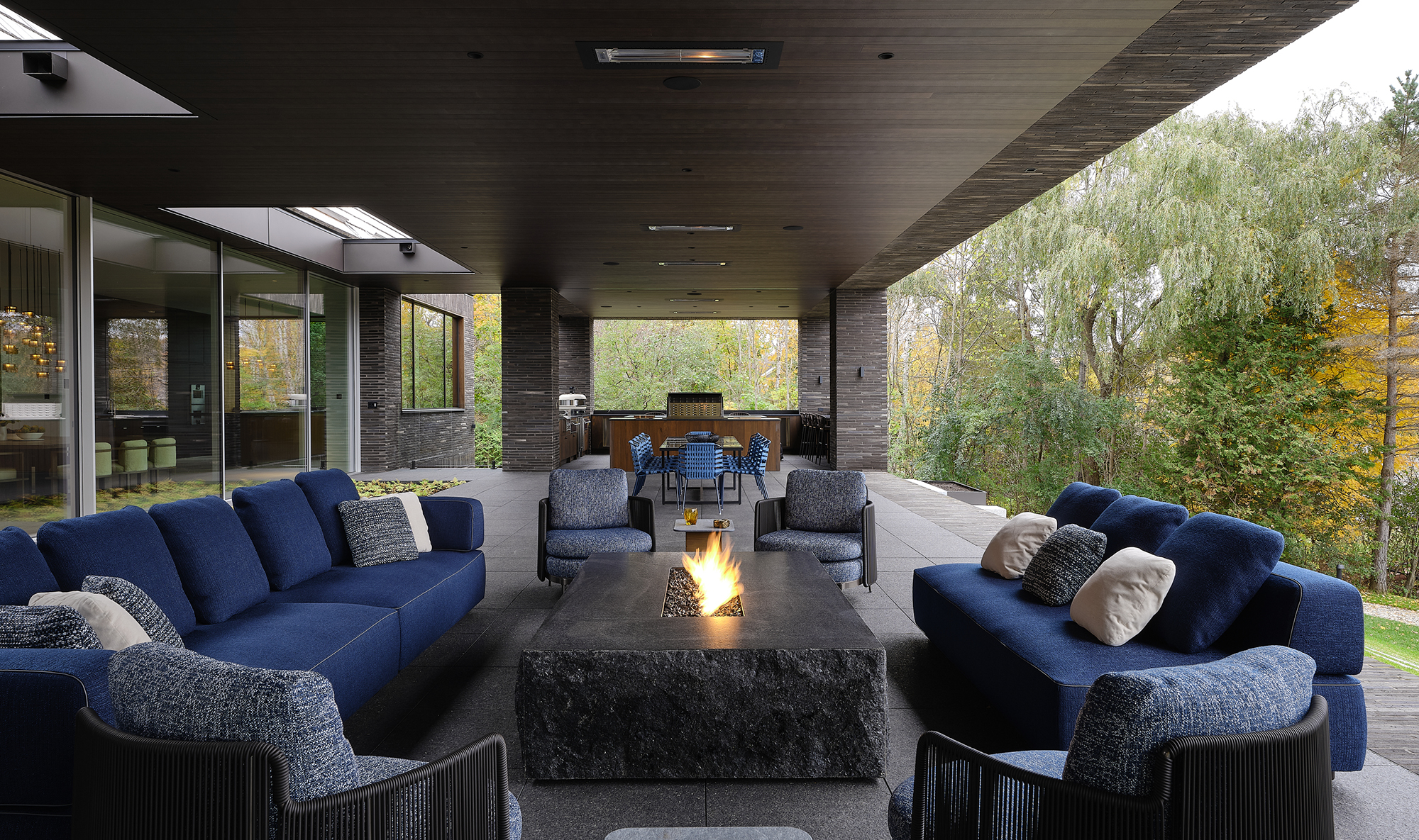 The carefully selected natural materials in both the interior and exterior are designed to develop a patina over time, reflecting the passage of years. The exterior walls are clad in dark-toned Randers Tegl waterstruck brick ULTIMA RT 151 from Denmark. The oversized roof beams were custom-made in a local workshop, while the masonry of the terrace, garden, outdoor kitchen, and fireplace consists of a blend of locally sourced black and gray Cambrian granite stones. Inside, the kitchen island features a robust stone block with a flamed walnut countertop and natural live edge, creating a stylish bar height.