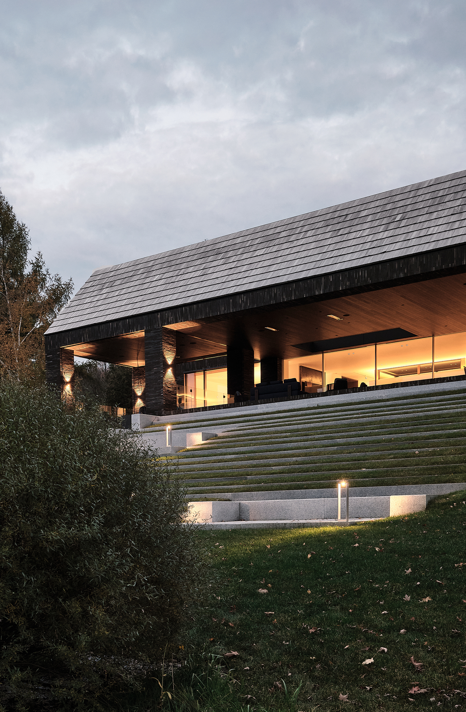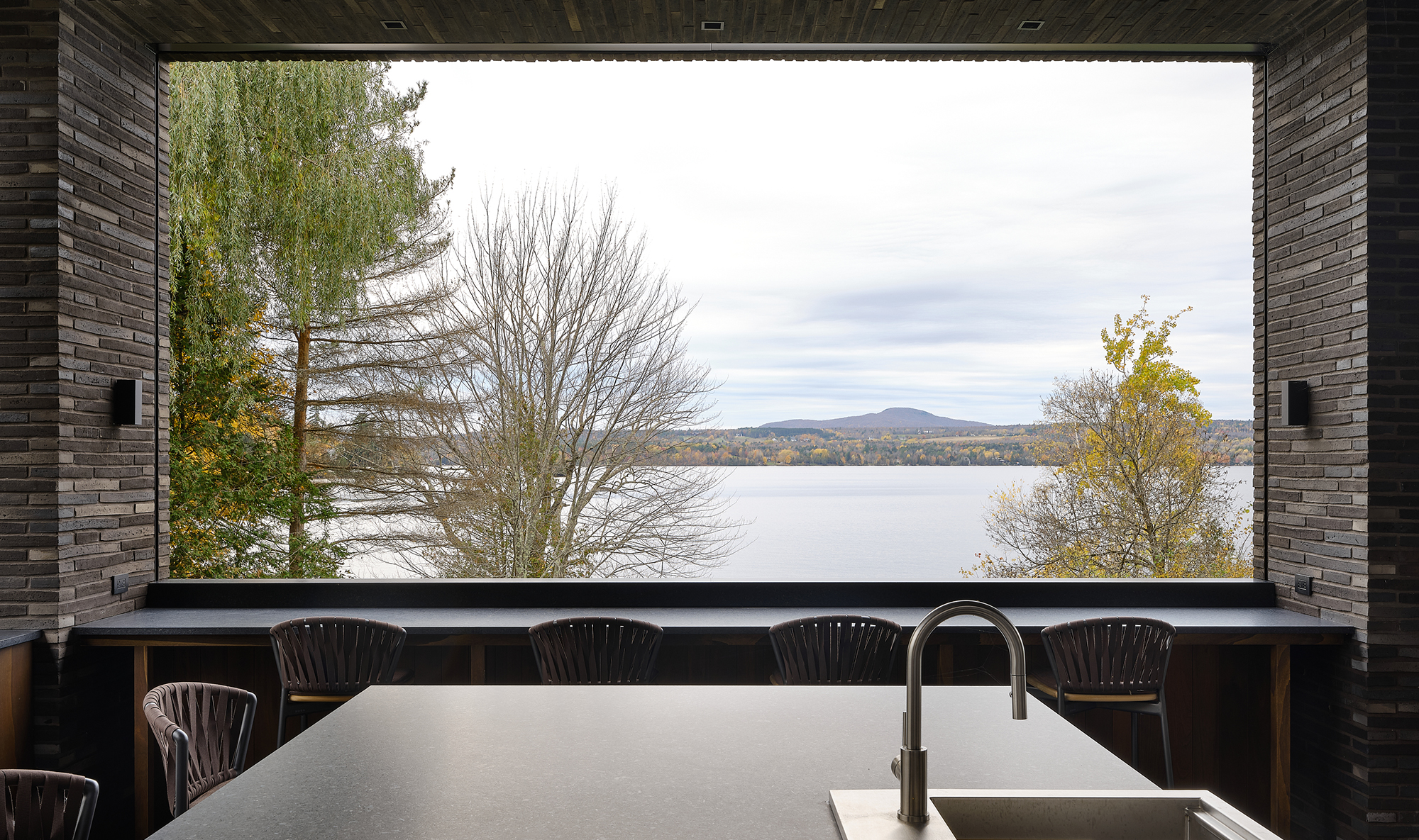 The Canadian construction project combines reinforced concrete, steel framing, and brick walls in an elegant structure. An innovative structural system allows for the use of glass spans exceeding 15 meters, maintaining an unobstructed view of Lake Memphremagog and the surrounding nature.