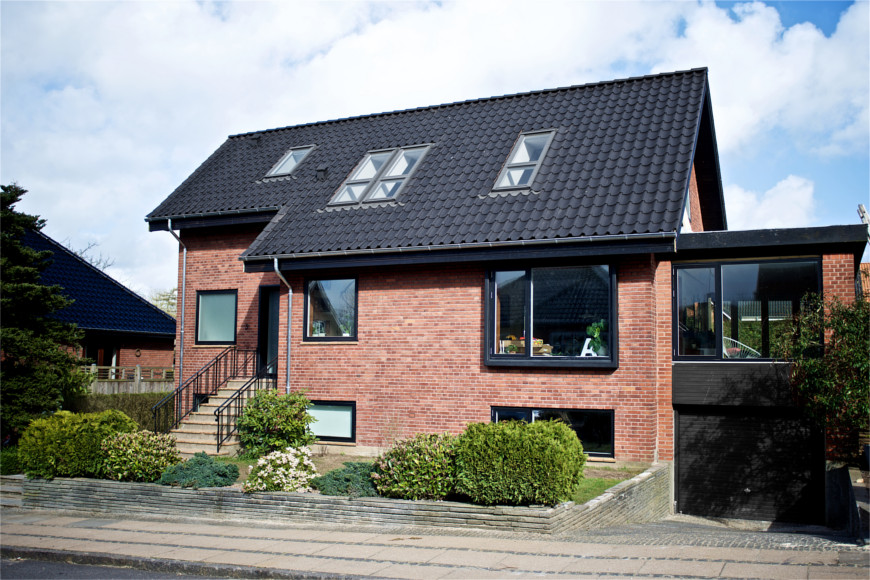 Huset er “født” med rødt tag og brune trævinduer, men parret valgte at skifte alle vinduer til sorte aluvinduer, og det var en markant ændring, som fik betydning for valget af tag.