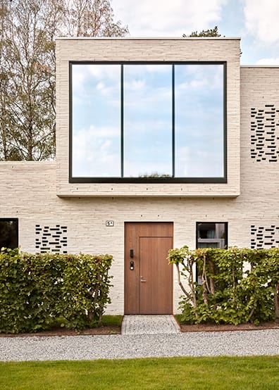 Denna tegelstens helvita färg och matchande murbruk ger fastigheten ett rent och lugnande uttryck, utan att det kompromissas med intresse.
