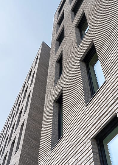 De mjuka rökgråa tegelstenarna på denna kontorsbyggnad är lagda i två plan, vilket förstärker deras linjära uttryck och tillför en visuellt intressant textur.