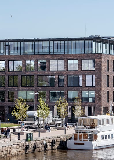 Denna rödbruna tegelstens större färgvariation skapar en hierarki av mönster och detaljer genom hela denna vattennära kontorsbyggnads interiör och exteriör.