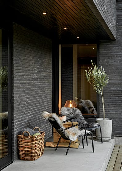 Dessa tegelstenars "livfulla" svarta färg får byggnaden att smälta in i sina skogsklädda omgivningar, samtidigt som den skapar en känsla av värme vid hemmets entré.