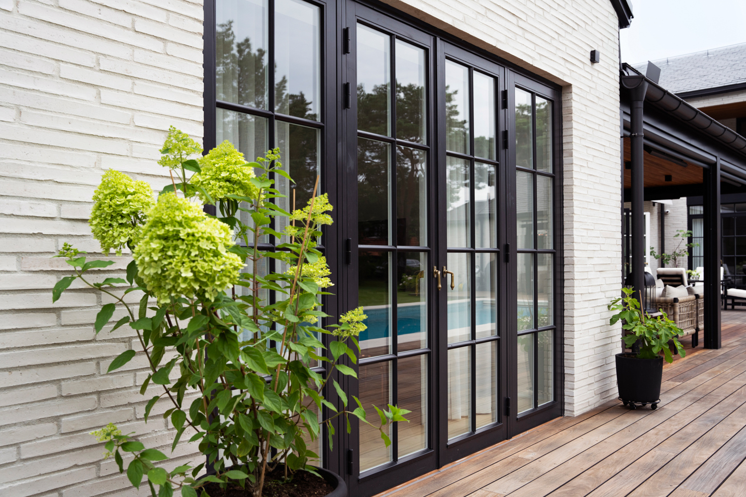 Skiffer på taket ger ett elegant, slätt intryck och harmoniserar fint med tegelfasaden. Naturmaterial användes genomgående, även till fönster, dörrar och undertak, för att säkerställa att huset åldras vackert och bär spår av genuint hantverk.